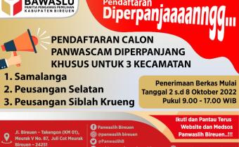 Berdasarkan Pengumuman Nomor : 026/KP.01.00/K.AC-13/10/2022 tanggal 1 Oktober 2022 tentang Perpanjangan Masa Pendaftaran Calon Anggota Panwaslu Kecamatan Dalam Rangka Pemilu Serentak tahun 2024, Perpanjangan pendaftaran dilakukan untuk 3 (tiga) kecamatan dalam wilayah Kabupaten Bireuen yaitu: 1) Kec