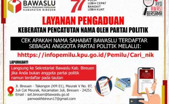 Bireuen - Panwaslih Kabupaten Bireuen sejak 11-23 Agustus 2022 telah menerima 3 (tiga) orang yang melaporkan bahwa dirinya telah dicatut secara sepihak oleh partai politik tertentu dan didaftarkan ke dalam sistem informasi partai politik (Sipol) untuk kepentingan dan keterpenu