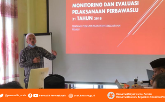 Jeuram – Panwaslih Provinsi Aceh melakukan Monitoring dan Evaluasi (Monev) pelaksanaan Perbawaslu terkait Pengawasan Penyelanggaran Pemilihan Umum, dan Penanganan Pelanggaran kepada Panwaslih Kabupaten Nagan Raya, pada hari Selasa tanggal 24 Agustus 2021 di sekretariat panwaslih set