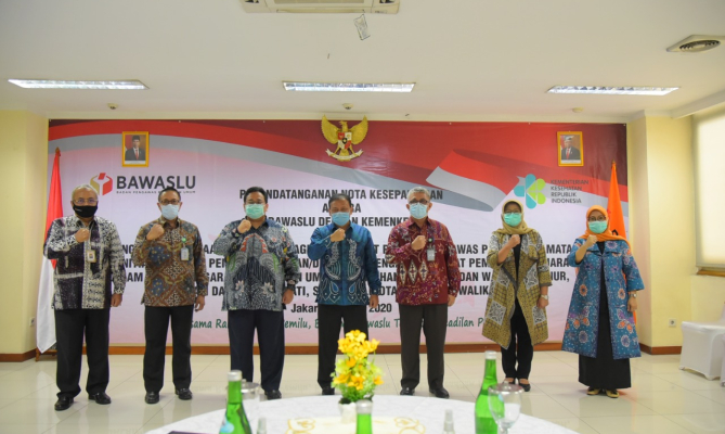 Jakarta, Badan Pengawas Pemilihan Umum – Kementerian Kesehatan Republik Indonesia (Kemenkes) mendukung dan bekerja sama dengan Bawaslu dalam memberikan perlindungan kesehatan bagi penyelenggara pemilu dan masyakarat. Dukungan ini tertuang dalam penandatanganan nota kesepahaman yang dilakukan di Kantor Bawaslu Jalan MH.Thamrin Menteng Jakarta, Selasa (21/7/2020).