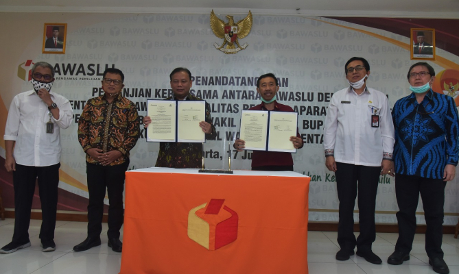 Jakarta, Badan Pengawas Pemilihan Umum – Bawaslu melanjutkan kerja sama dengan Komisi Aparatur Sipil Negara (KASN) dalam bentuk Perjanjian Kerja Sama (PKS) Pengawasan Netralitas ASN pada Pilkada 2020. Ketua Bawaslu Abhan bersama Ketua KASN Agus Pramusinto menandatangani PKS di Kantor Bawaslu Thamrin Jakarta, Rabu (17/6/2020).