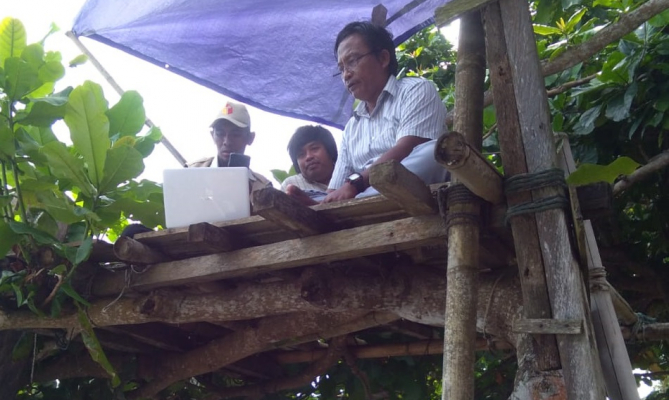 Di Desa Malei, Asrul bersama para staf harus rela mengikuti acara virtual tersebut dengan menaiki pohon. Dari atas dahan, mereka mengikuti kegiatan secara saksama. Beruntung ada semacam ‘bilik’ darurat yang bisa dimanfaatkan guna mendapatkan sinyal internet.