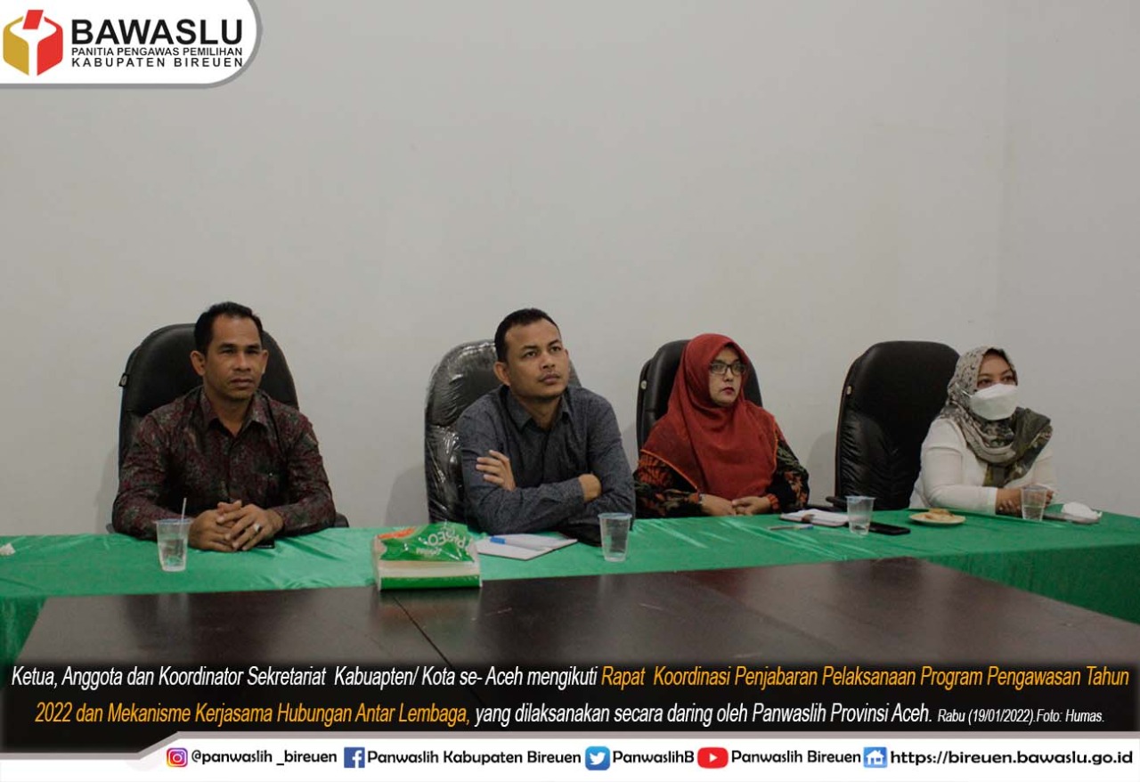 Bireuen – Dalam rangka mempersiapkan pengawasan Pemilu serentak tahun 2024 mendatang, Panwaslih Provinsi Aceh mengadakan rapat koordinasi penjabaran pelaksanaan program pengawasan tahun 2022 dan mekanisme kerjasama hubungan antar lembaga, Rabu (19/01).