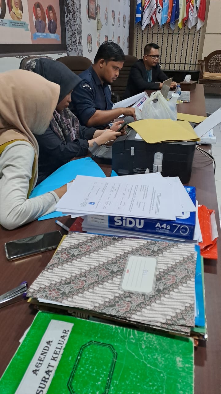 Bireuen – Ketua Panwaslih Bireuen Rahmad didampingi staf melakukan pengawasan hari terakhir Pencermatan Rancangan Daftar Calon Tetap (DCT) Calon Anggota DPRK Kabupaten Bireuen untuk Pemilu Tahun 2024 di Kantor KIP Bireuen, Selasa (3/10/2023).