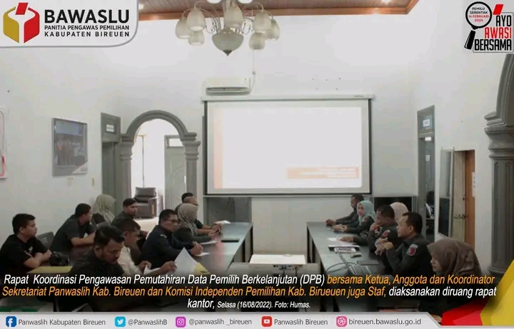 Bireuen - Panwaslih Kabupaten Bireuen melaksanakan rapat koordinasi dengan KIP Kabupaten Bireuen terkaitr Pemuktahiran Daftar Pemilihan Berkelanjutan (DPB) Semester 1 tahun 2022. Ditambah DPB terakhir pada Bulan Juli 2022. Berlangsung di Aula Sekretariat Panwaslih Bireuen, Selasa (15/8). Rakor dihadiri oleh ketua dan anggota panwaslih maupun ketua dan anggota KIP.