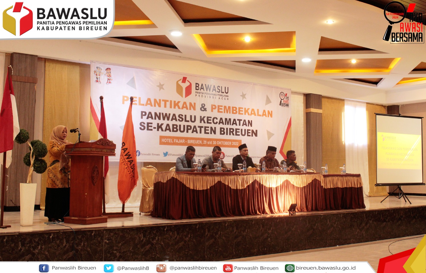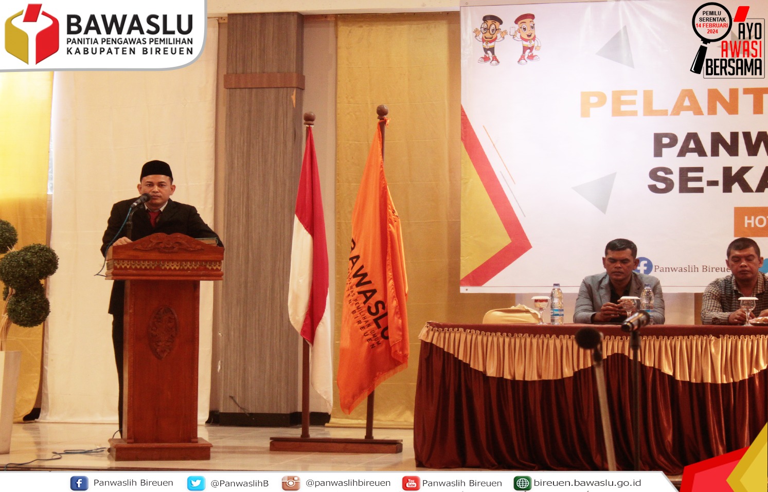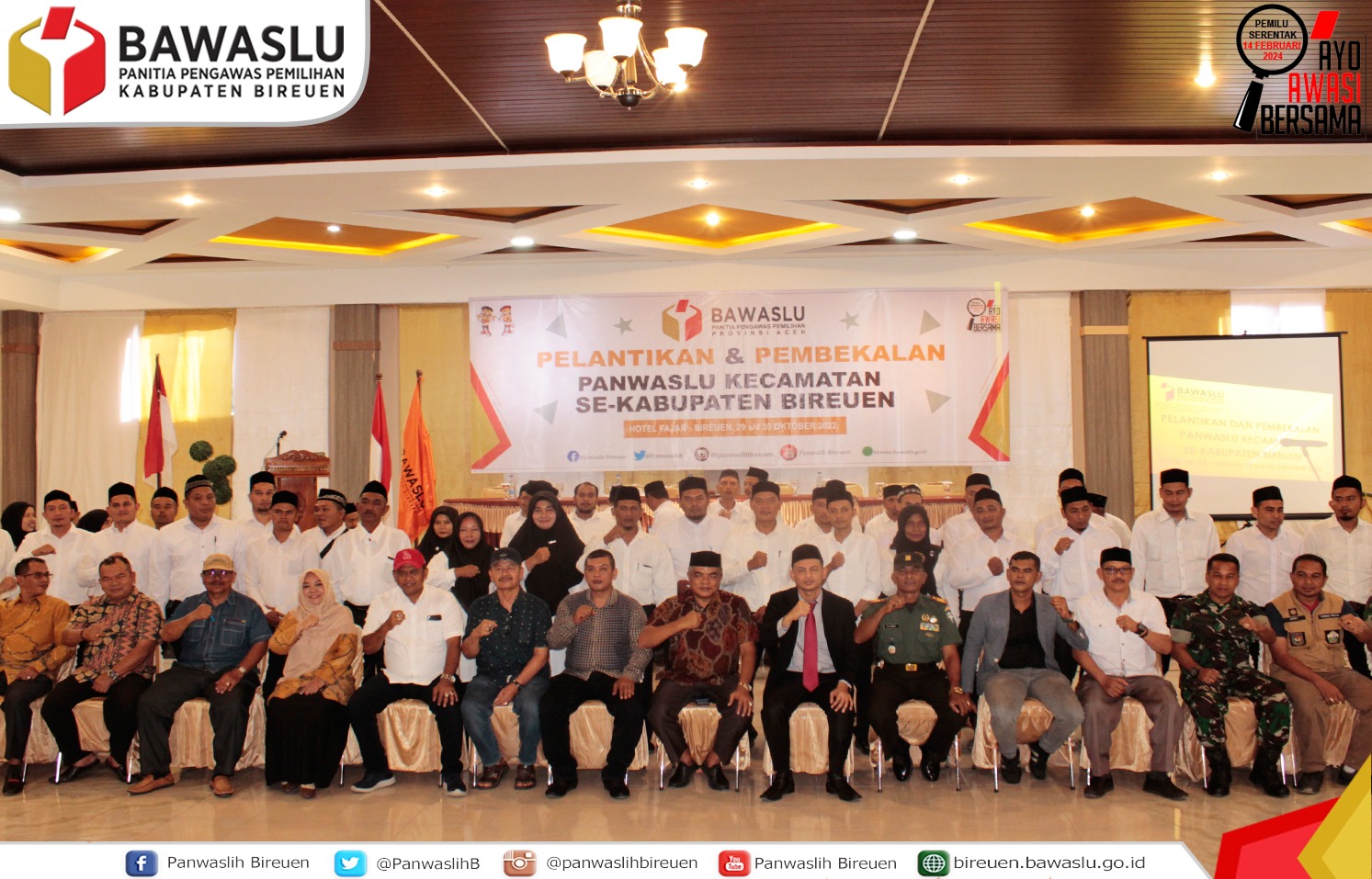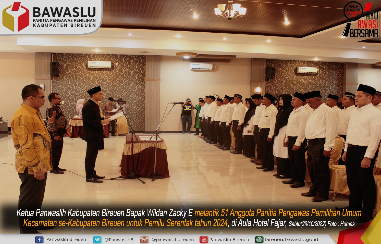 Bireuen - Sebanyak 51 orang dari 17 kecamatan dalam wilayah Kabupaten Bireuen resmi dilantik sebagai anggota Panitia Pengawas Pemilu Kecamatan (Panwascam). Ke-51 orang yang sebelumnya telah dinyatakan lulus seleksi adm, ujian tertulis dan wawancara tersebut dilantik langsung oleh ketua Panwaslih Bireuen, Wildan Zacky di Hotel Fajar, Sabtu (29 /10) .