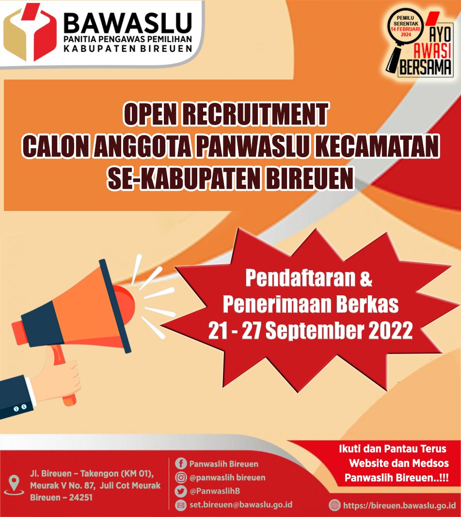 Bireuen - Dalam rangka memaksimalkan pengawasan pemilu serentak tahun 2024, Panwaslih Kabupaten Bireuen melakukan rekruitmen Panitia Pengawas Pemilu (Panwaslu) Kecamatan, untuk 17 kecamatan yang penerimaan berkas pendaftarannya dimulai sejak 21-27 September 2022 yang akan datang.