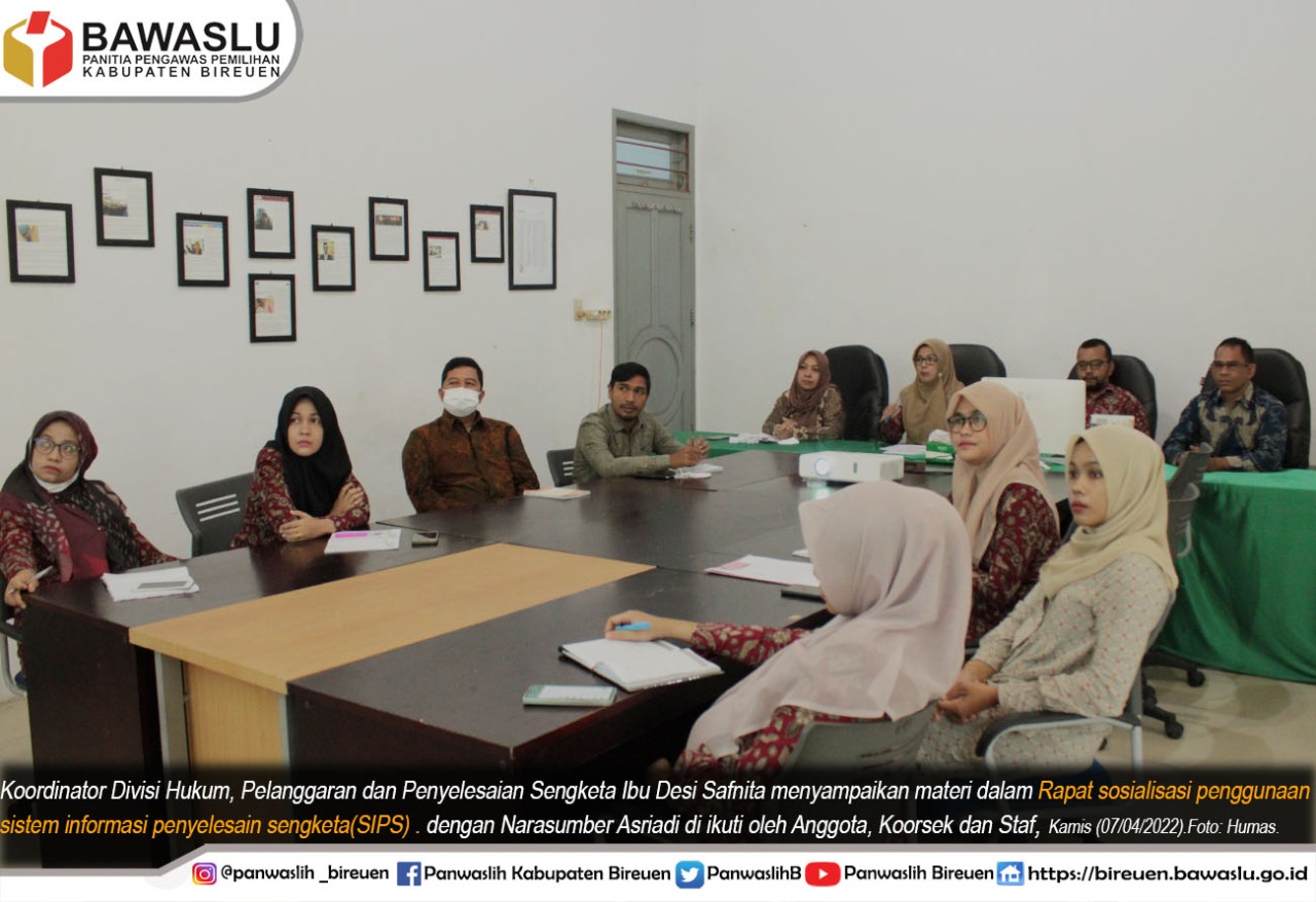 Koordiv. HPPS Panwaslih Bireuen Desi Safnita mengungkapan kebutuhan akan hal tersebut dan merespon dengan melakukan sosialisasi penggunaan aplikasi Sistem Informasi Penyelesaian Sengketa (SIPS) bagi internal kesekretariatan Panwaslih Bireuen.