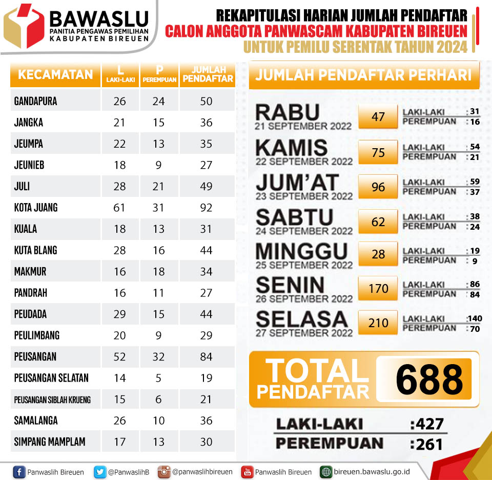 Bireuen – Hingga hari terakhir pendaftaran, Selasa, 27 September 2022, pendaftar Panwaslu Kecamatan untuk pemilu serentak tahun 2024 di Kabupaten Bireuen mencapai 688 pendaftar yang terdiri dari 427 laki-laki dan 261 perempuan.