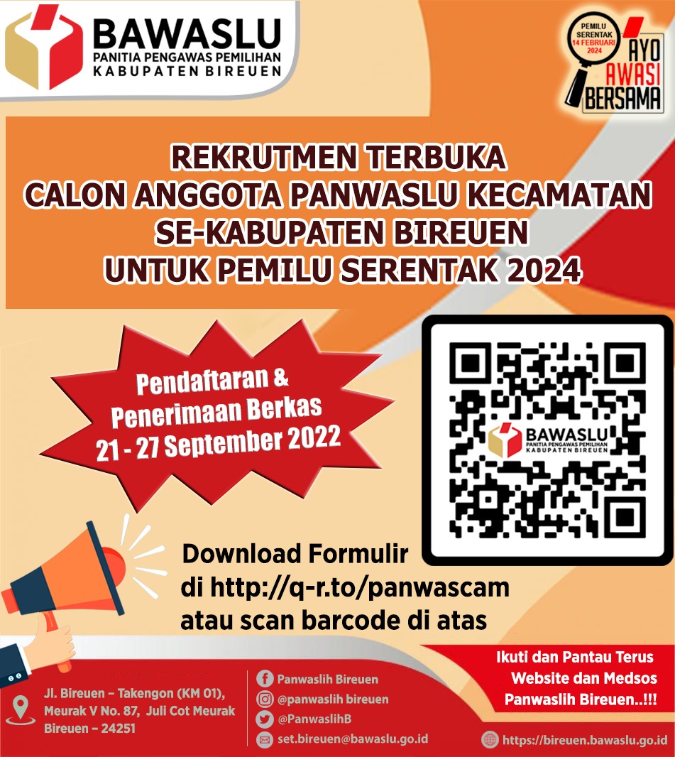 Dalam rangka pembentukan Panwaslu Kecamatan dalam Pemilu Serentak tahun 2024, Kelompok Kerja Pembentukan Panwaslu Kecamatan Kabupaten Bireuen berdasarkan Peraturan Badan Pengawas Pemilihan Republik Indonesia Nomor 19 Tahun 2017 sebagaimana diubah terakhir dengan Peraturan Badan Pengawas Pemilihan Umum Republik Indonesia Nomor 8 Tahun 2019, atas kewenangan yang diberikan oleh Undang-Undang Nomor 7 Tahun 2017, membuka kesempatan bagi Warga Negara Indonesia yang memenuhi persyaratan untuk mendaftarkan diri sebagai calon anggota Panwaslu Kecamatan Kabupaten Bireuen.