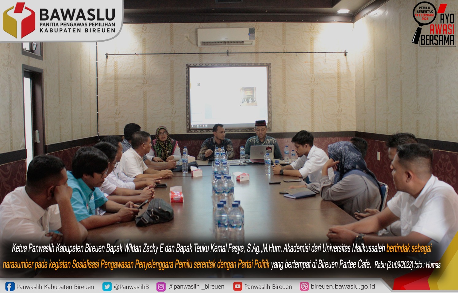 Bireuen – Selain peserta pemilu, penyelenggaranya juga harus diawasi. Hal itu disampaikan Teuku Kemal Fasya saat mengisi acara Sosialisasi Pengawasan Penyelenggaraan Pemilu dengan Multi Stakeholder yang diselenggarakan Panwaslih Kabupaten Kab. Bireuen di Aula Rapat Bireuen Partee, Rabu (21/9).